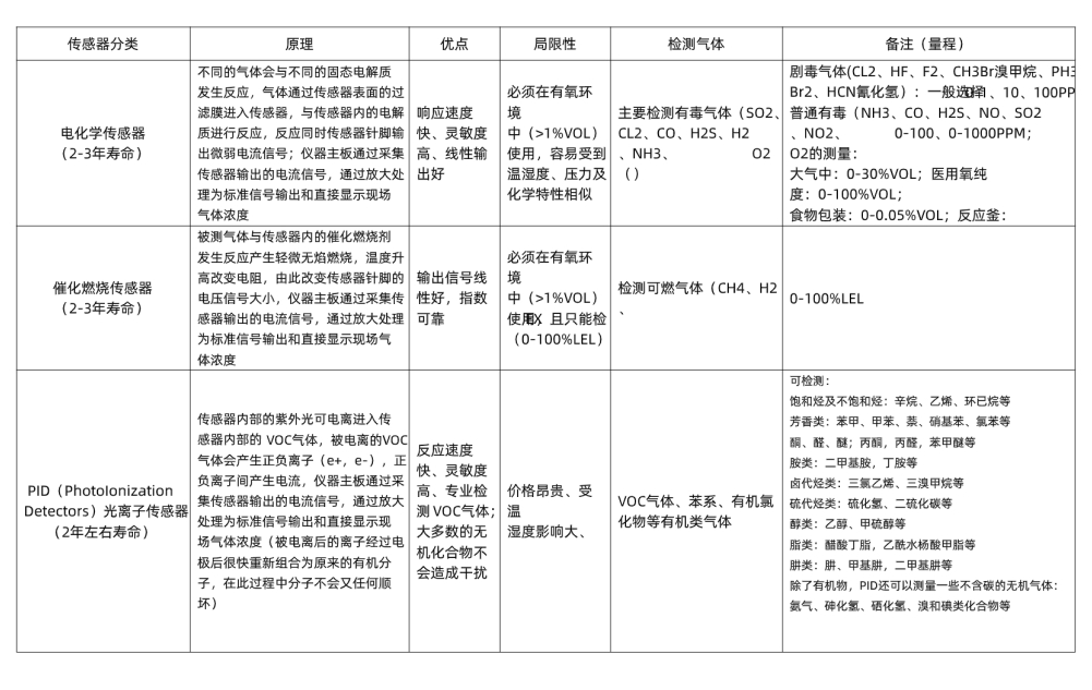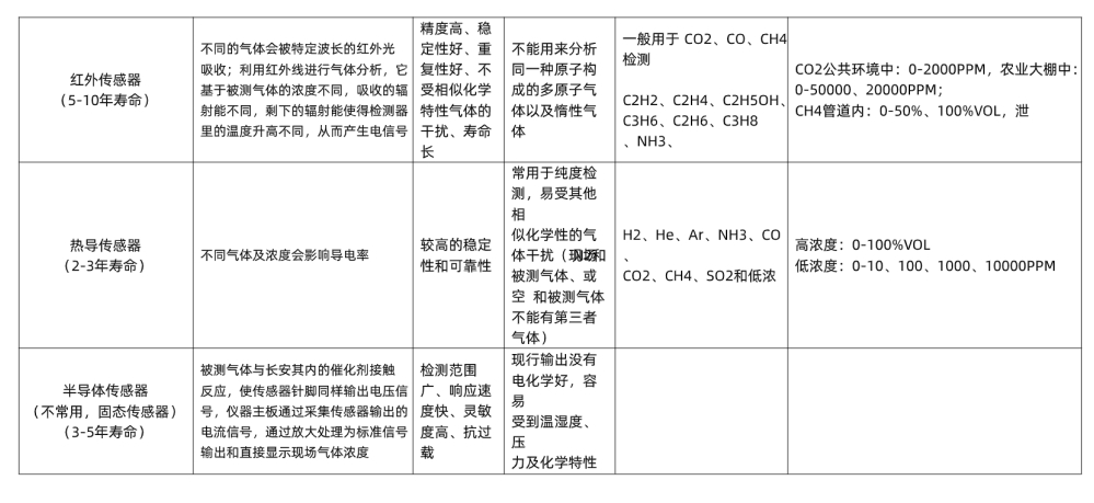各種原理傳感器檢測氣體&量程